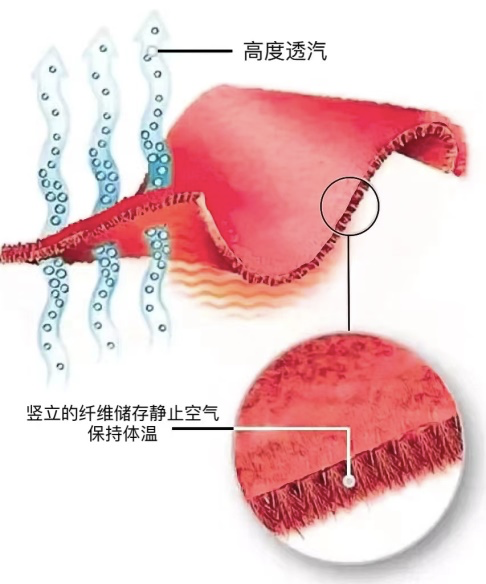 中层绒衣的主要需求是轻便保暖,这是一款用于场馆内的制服。在它身上我们再一次见证了当功能遇到外观的纠结,在权衡中必有取舍。项目后期,当服装功能遇到服装外观设计方案时(早期是服装功能与外观两条腿走路),如何最大限度完美实现设计的状态下对面料工艺的要求就更高。在服装设计方案无法改变的情况下,近乎于要求面料工艺配合设计做单向调整。为了保持绒衣已有的轻便保暖特性,我们尝试了多种面料加工工艺。压力与动力并存,高要求所带来的挑战同样也给我们带来了真正意义上的技术瓶颈突破。