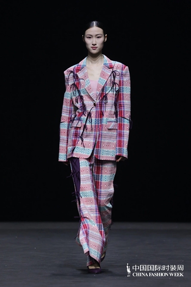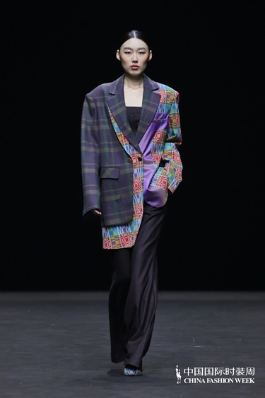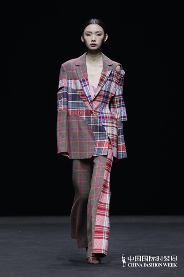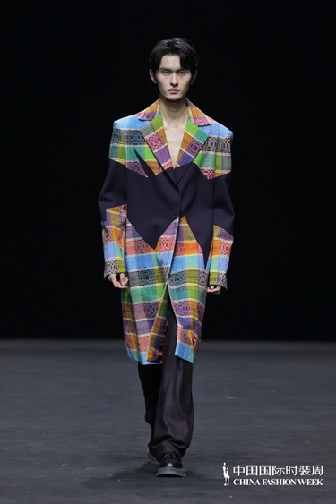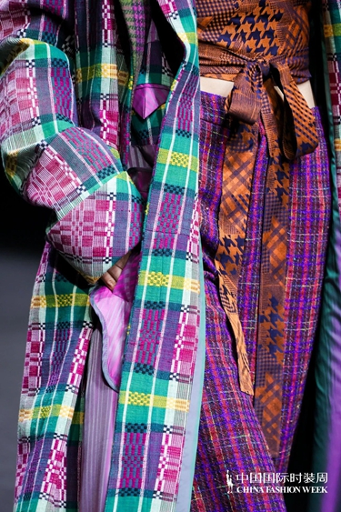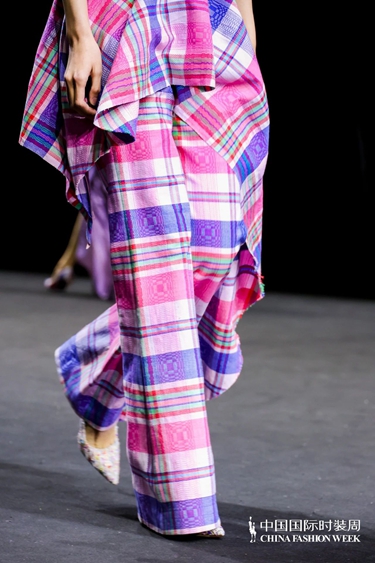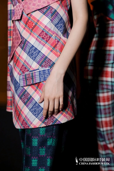 本次发布会主题为“九野拾遗”,其中,“九野”隐喻了东方文明的广袤精神原野,指向东方大地的先民生存智慧;“拾遗”则是对散佚于民间的文化记忆的系统性考察、转译与创造性再生。发布会展示了53套作品,以“经纬叙事:土布织造的诗性重生”为灵感主线,聚焦华东地域三大纺织非遗体系:黄河农耕文明的符号织造“山东鲁锦”、江海交汇处的生态智慧“崇明土布”、近代实业精神的工艺见证“南通色织土布”,通过设计解构和土布织物的组织结构新设计,探讨民间非遗土布织物的应用外延,重塑民间文化记忆。
