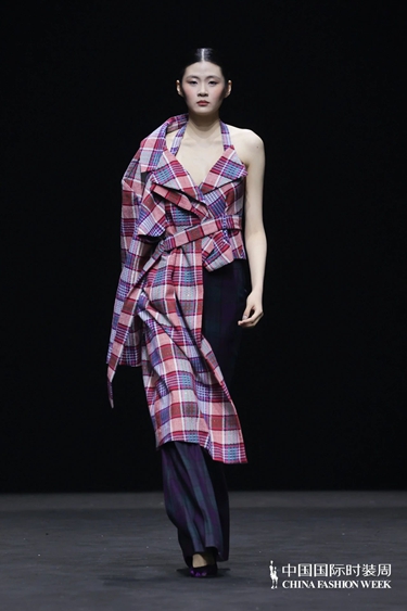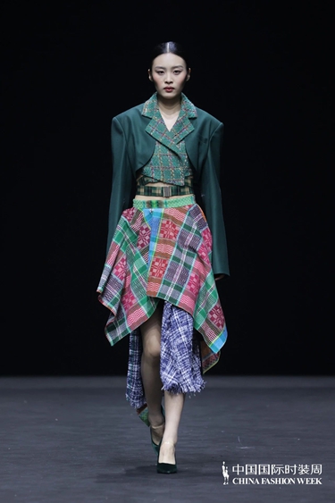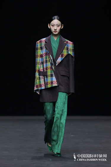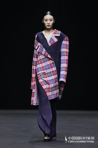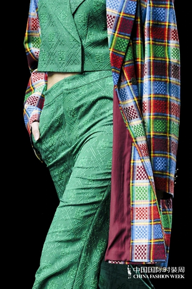 第三、四系列以深绿色、红色、黑色为主色调的山东鲁锦土布为主体材料,系列整体色调浓烈、厚重。设计中保留了传统土布的大块织物使用,通过精粗纺毛织物、格纹花呢等多种材料的层叠与内外结构穿插形成多层次交叉虚实感;结构细节上增加纯色与格子纹样的切割穿插,打破传统土布以往只能以风衣外套等款式呈现的单薄感,消解了土布织物的民俗风格和设计局限。
