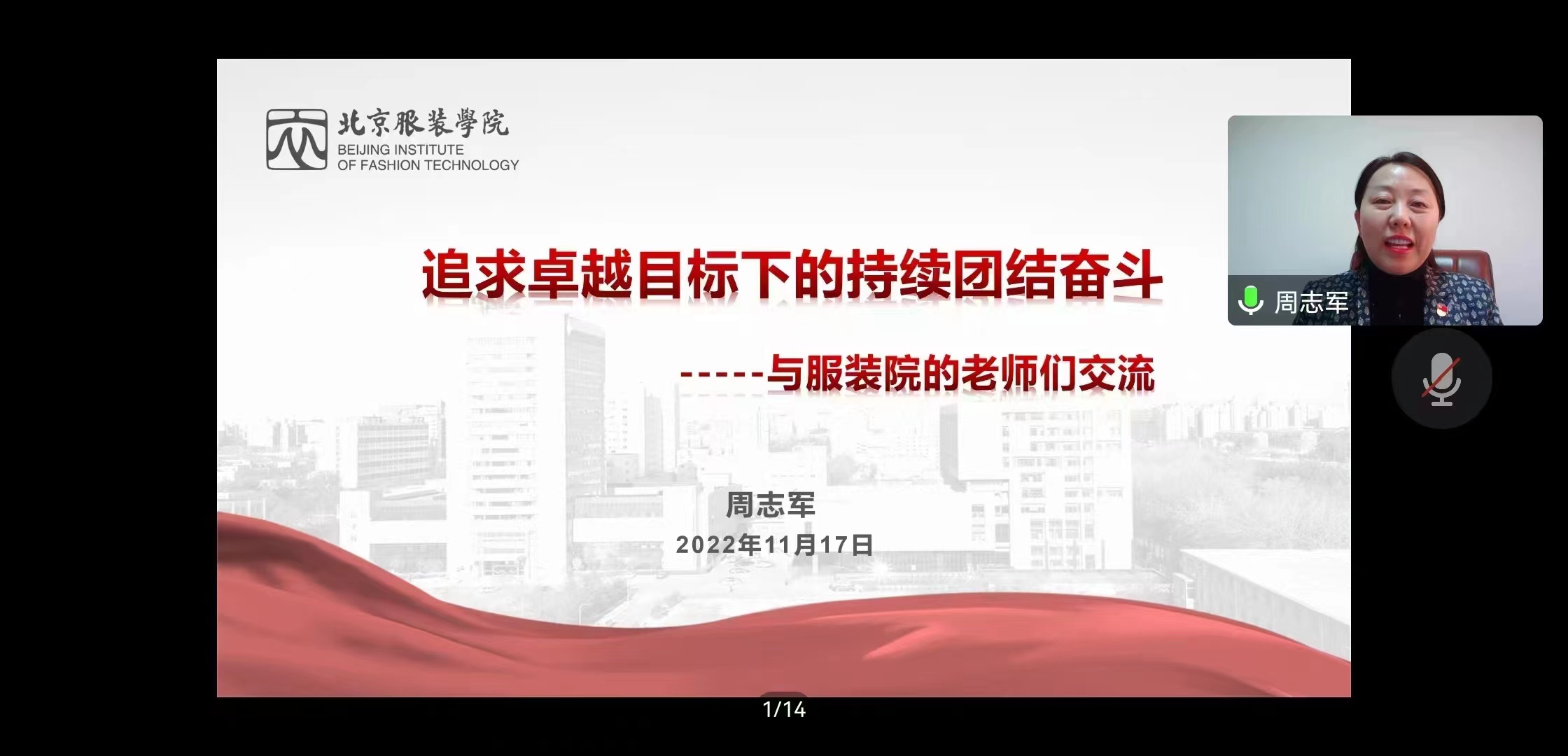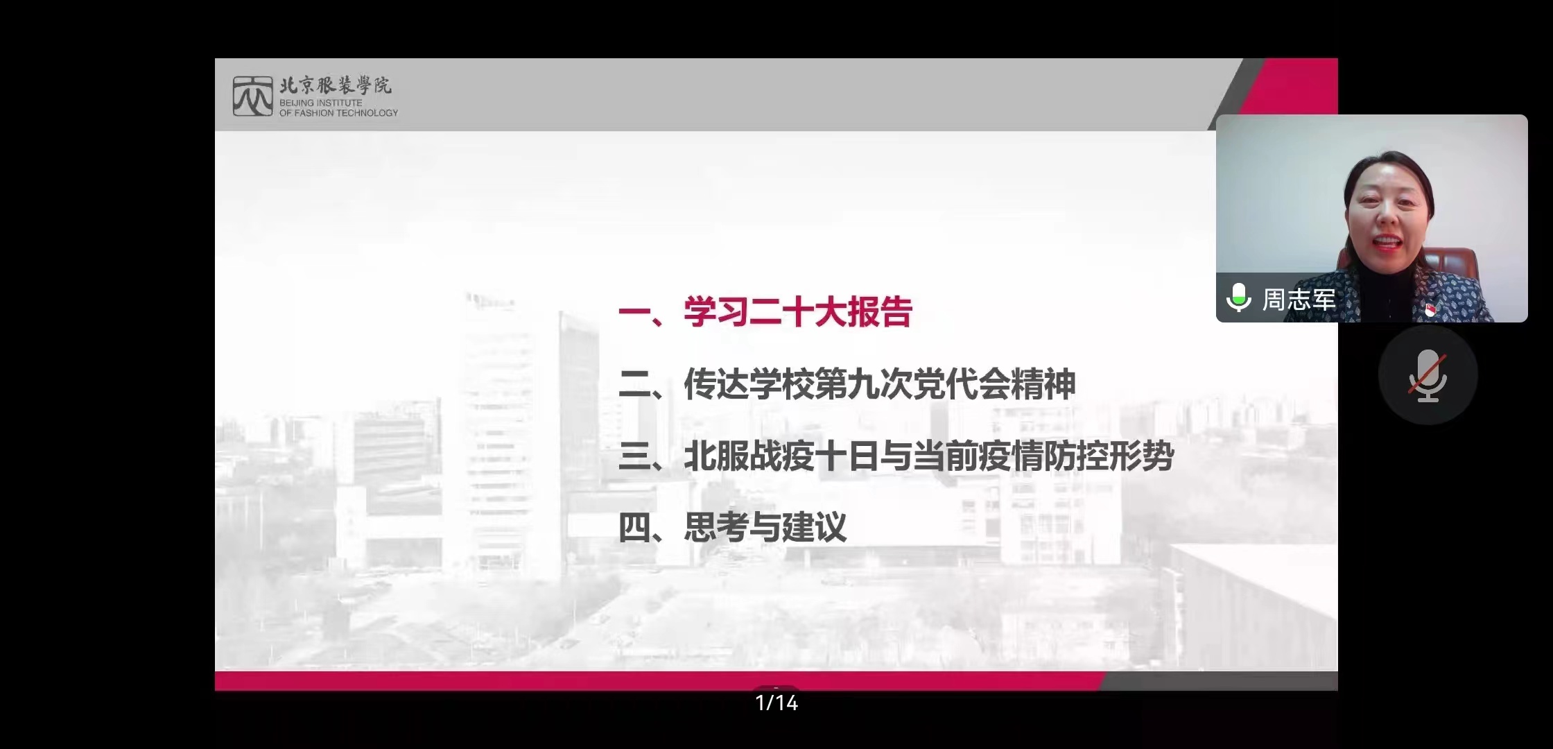 周志军还带领全体教师回顾了战疫十日里,全校上下团结一心,在市委教育工委的指导下,校地协同处置疫情的成效和经验。她围绕建立完善的应急处置体系、风险人员转运、关心关爱隔离人员、校区联动,严格各校区管理、解除隔离、平安回家七方面,讲述了本轮新冠病毒的新特点,传达分析了目前北京市以及北京市教育系统的防疫政策,强调每位老师仍要提高警惕,认识到形势严峻性,要向学生讲清讲透相关政策和要求。周志军强调,整个战疫过程中无不体现出北服师生的必胜信念和磅礴力量,北服人守土尽责,充分弘扬了团结奋斗的精神,这种精神力量是学校发展的重要精神保障,也是我们从这场疫情阻击战中得到的最大收获。