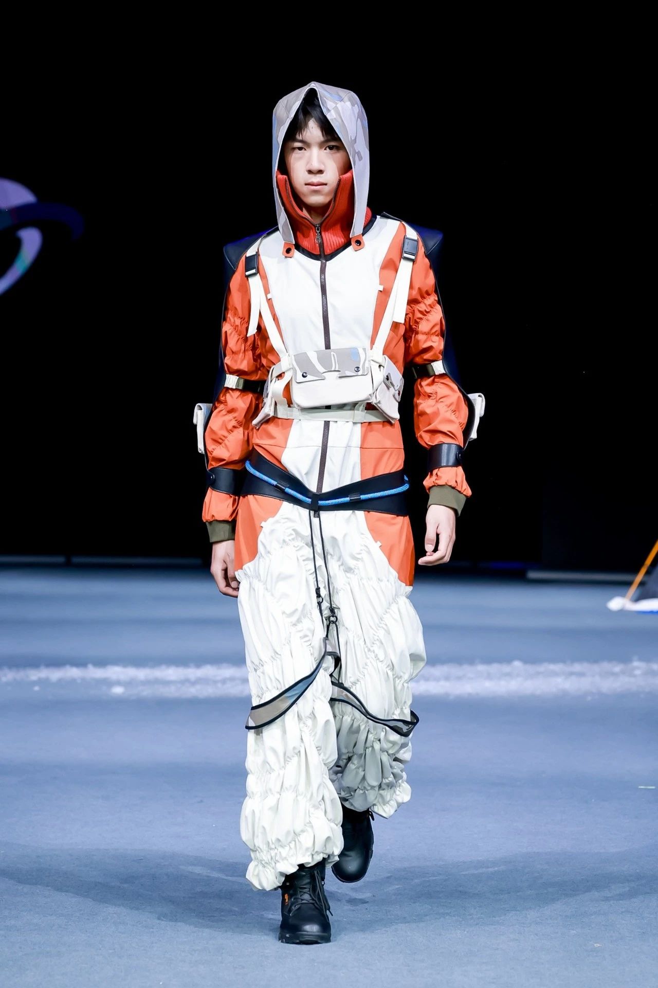 聚焦功能性时尚的 “运动服装设计展演” 以 “山止川行” 为主题亮相。38位毕业生带来117套作品,精准覆盖户外露营、城市骑行、溪流路亚等高阶运动场景,将科技面料与潮流设计深度融合,彰显出“以功能为根基、以美学为桥梁、以文化为魂”的专业教育理念。展演以 “户外探索”“城市运动”“未来创意” 三大板块展开,从自然融合、人机互动到未来畅想,配合艺术体操与健美操表演,立体化呈现运动服饰与身体动态的叙事张力。