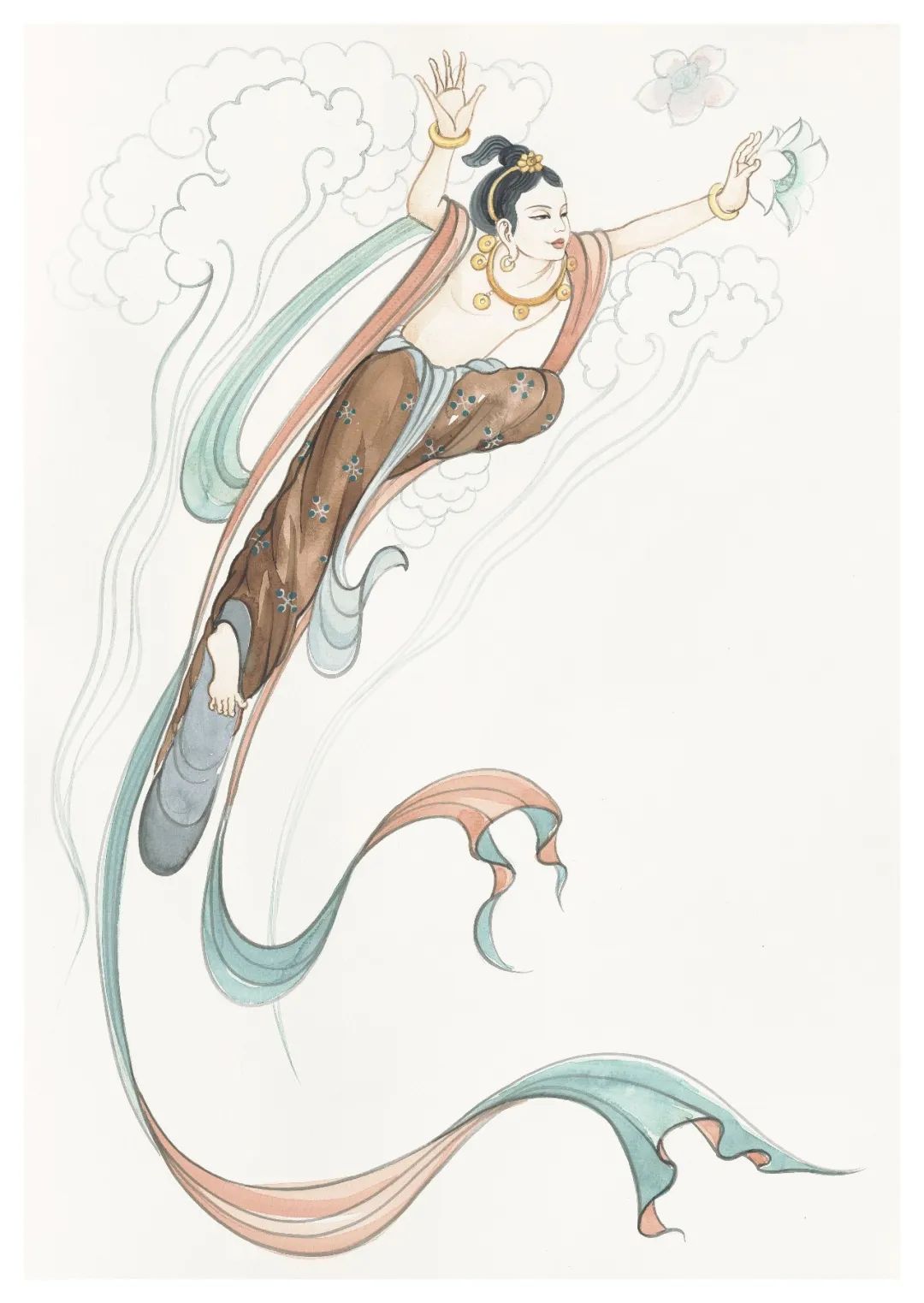 天人又称天众,在佛教中指的是住于欲界六天及色界诸天之有情,亦指住于天界或人界之众生。包括天部诸神及伎乐、化生等。在佛国世界具有护佑、赞叹、供养佛法的等职能。虽然源于虚空的天界,但是天人的形象和服饰却是现实世界的反映和升华。