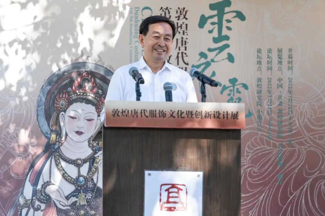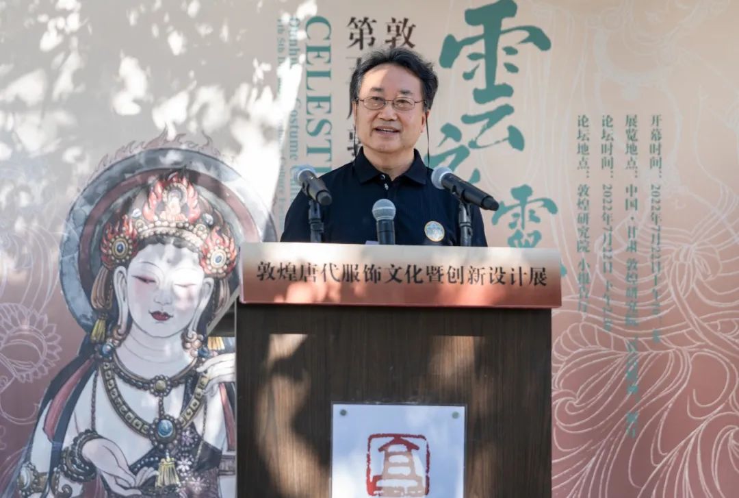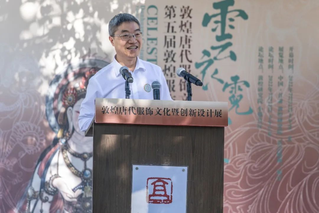 开幕式伊始,赵声良书记致辞,他代表敦煌研究院热烈欢迎各位领导、专家、同学的到来。他特别提到敦煌服饰文化研究是敦煌学重要的组成部分,希望展览能够更好地传承和弘扬敦煌文化艺术的魅力,把敦煌服饰文化研究引向深入,同时通过创新设计为社会服务,令敦煌文化更有活力。
