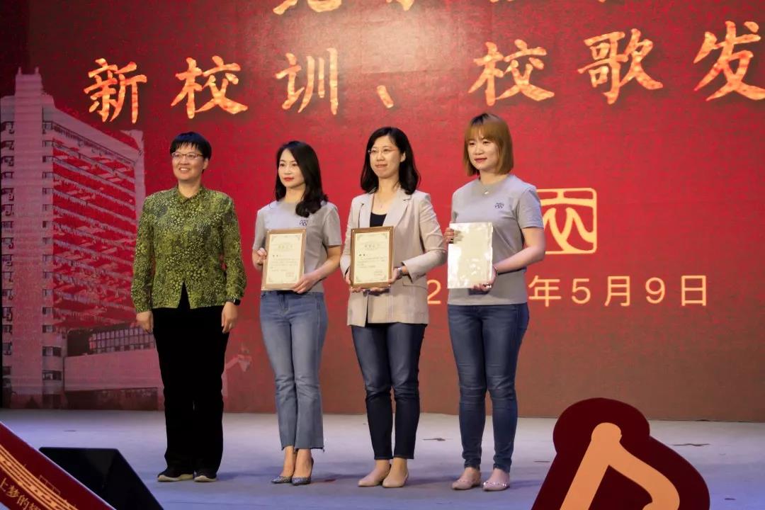 党委常委、副院长廖青为校歌词曲作者(从左到右:萧萍、郄程、戚晓旭)颁发证书