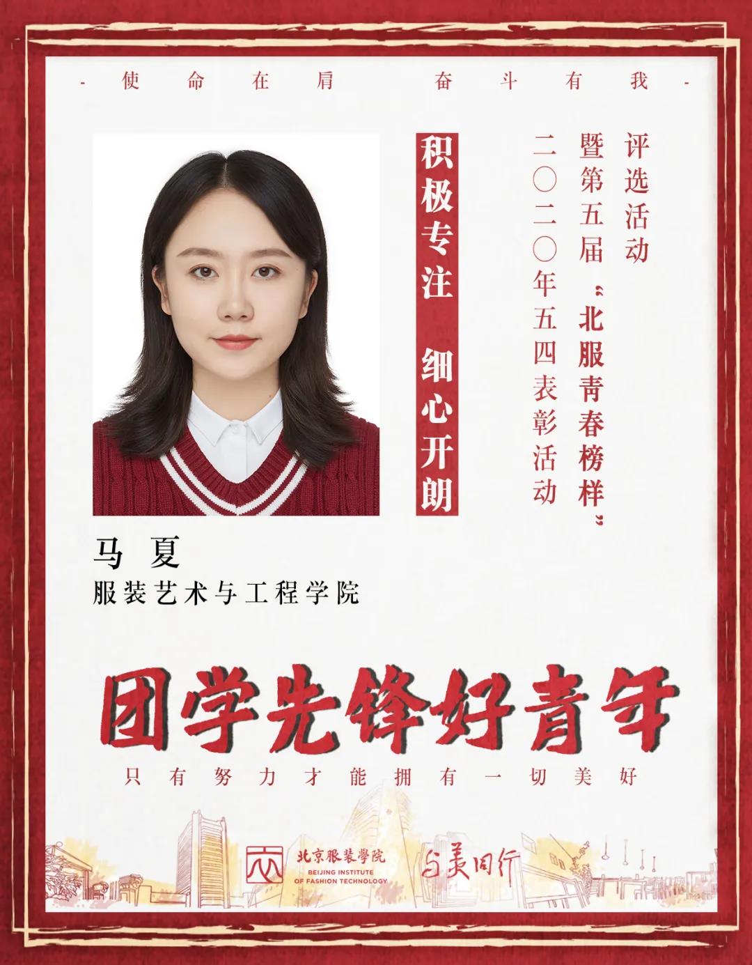 她用六年的北服时光不断探求着艺术的魅力,在学海中不断勾勒北服学子追求艺术风华的样貌。四篇论文的发表、书籍的撰写、服装新材料独有专利的申请就是她对崇艺尚美的最好诠释。在学校艺术活动总能看见她积极参加的身影,她用自己的实际行动引领北服青年,与美同行,逐梦芳华。