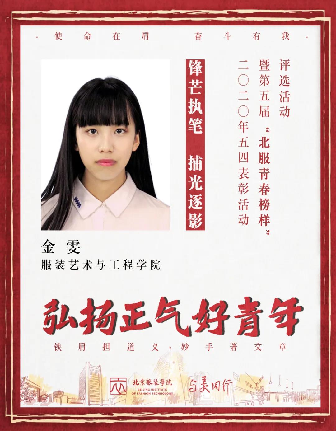 本科、研究生期间连续五年保持专业成绩第一名,斩获国家奖学金奖励、个人“优秀毕业生”荣誉称号的她,用刻苦钻研的求学精神引领北服学子开拓进取、勇攀高峰;策划组织“宿舍文化节”,协助学院成功举办“樱花时尚影展”“2019首届时尚传播国际峰会”等活动的她,用勇于承担的使命责任带领北服青年砥砺前行、逐梦青春。