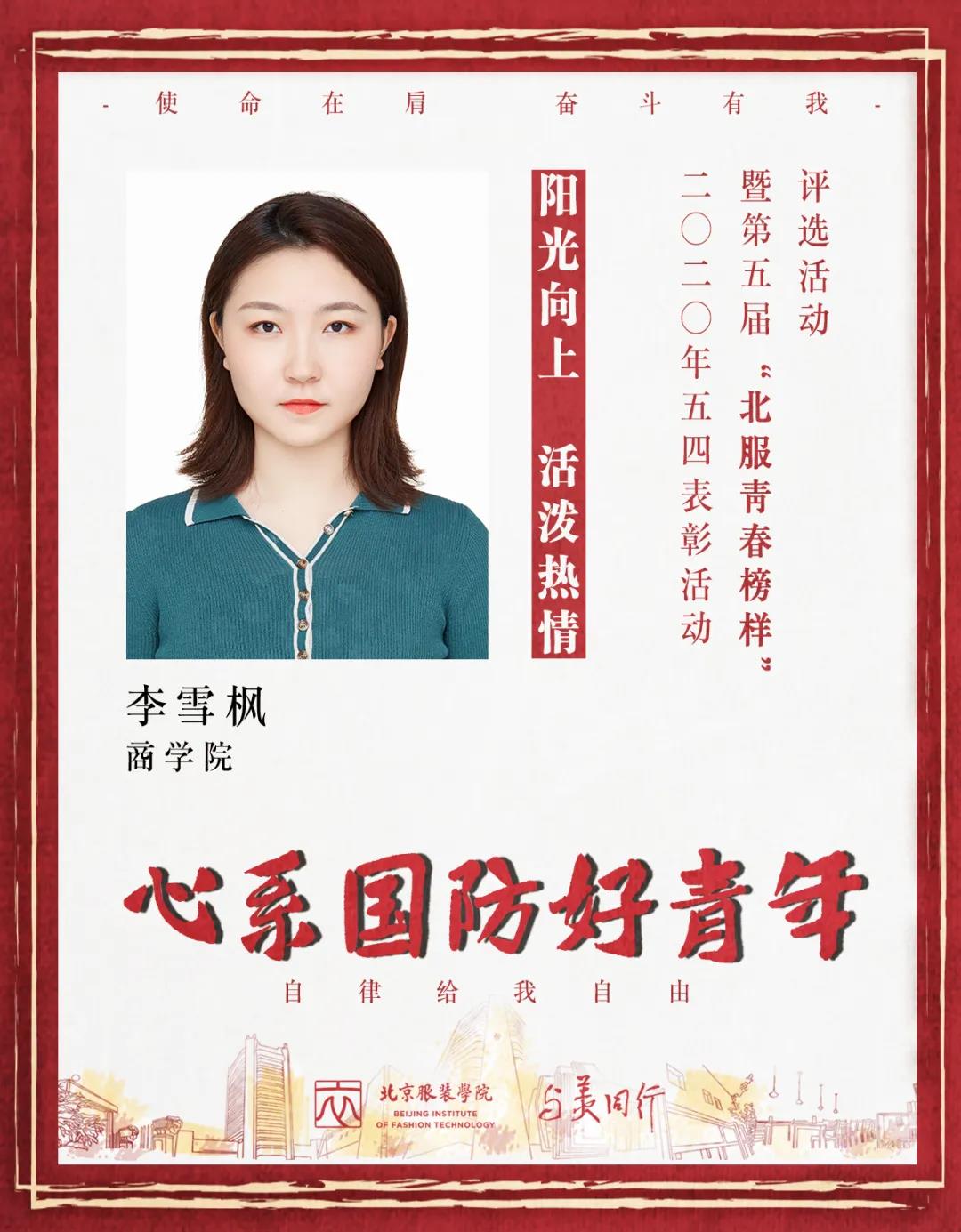平易近人,谦虚好学是她待人接物秉承的原则;踏实认真,戒骄戒躁是她处理工作恪守的准则;积极进取,不断创新是她组织活动坚持的标准。作为一名北服学生干部,北京市“优秀学生干部”、bb贝博艾弗森官网“优秀团干部”、70周年群众游行活动 “训练之星”以及“先进个人”,斩获无数个人荣誉的她始终坚守着心中的执着,那就是携手北服青年,共同开创更加辉煌的成绩,用自己的青春力量书写无愧于这个时代的最美颂歌。