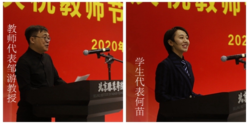 随后,学生代表材料设计与工程学院轻化工程专业2017级何苗同学代表全校学生向老师们送上了诚挚的节日问候;服装艺术与工程学院邹游教授作为教师代表发言。作为我校国庆盛典系列服装设计团队负责人,邹游教授始终秉承着把每一次的任务当作使命,以精益求精的职业精神,力求做到“快半步,美起来,好一点”,以快速、专业、严谨的工作态度,不辱使命,高质量完成了任务。他讲到,在教育学生的过程中与学生共同学习、成长,不断思考、探索、实践、改革创新,为教育事业的发展和祖国的繁盛贡献力量。