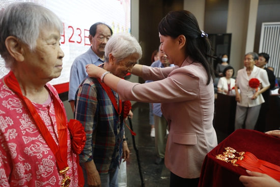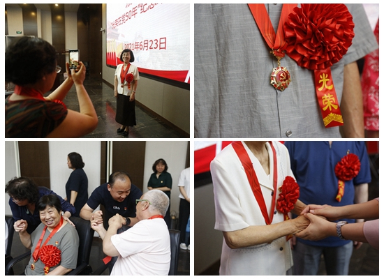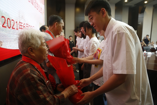 座谈会在庄严的国歌声中拉开帷幕。首先,倪赛力副书记宣读了荣获“光荣在党50年”纪念章的我校67位老党员名单,校党委书记周志军,党委副书记倪赛力,党委常委、纪委书记毛百战为到会的24名老党员代表一一颁发并佩戴好纪念章,新入党学生党员代表为老党员献上鲜花表达对爷爷奶奶们深深的敬意,这一互动环节充分体现了新老党员初心使命的接续与传承。