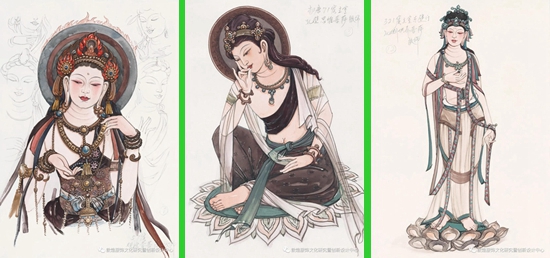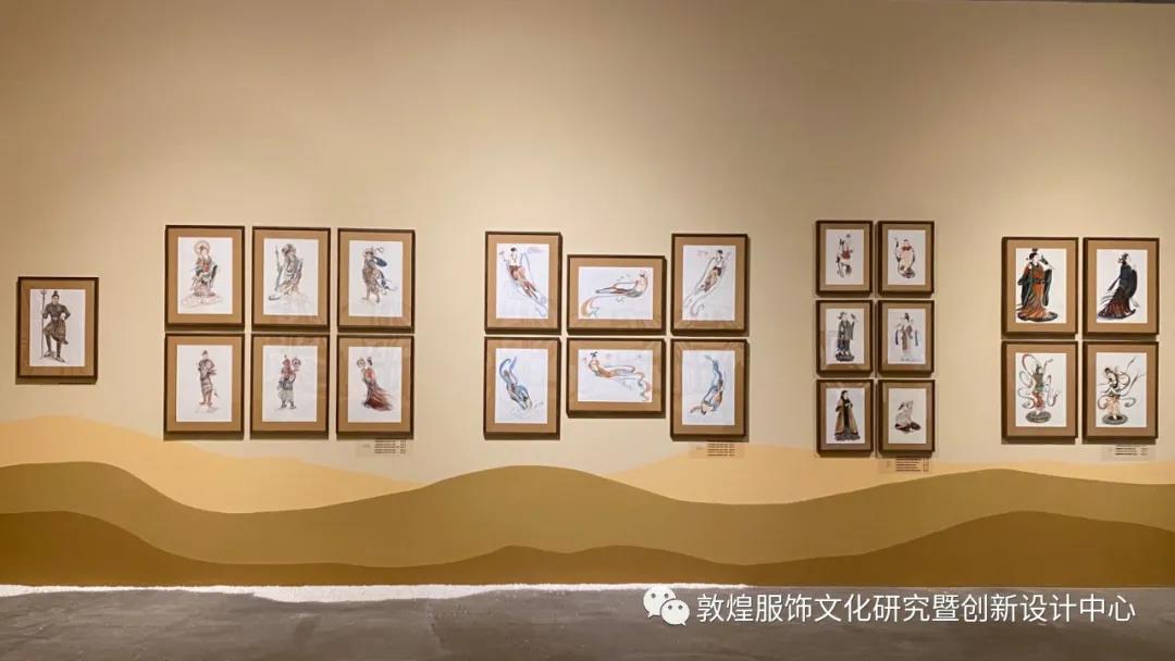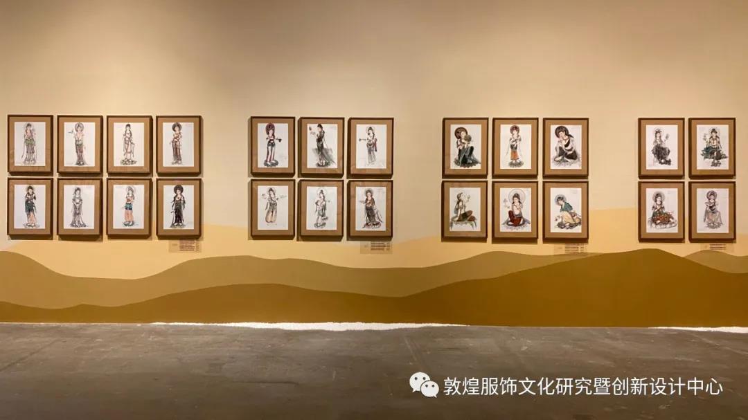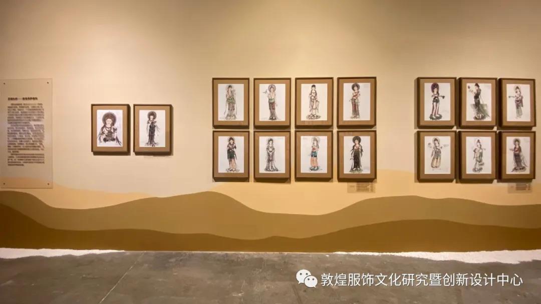 此次展出的是敦煌服饰文化研究暨创新设计中心团队成员以敦煌石窟实地考察为基础,结合文献资料查证,根据敦煌壁画或彩塑图像整理绘制的人物服饰效果图和重点图案细节图,以及具有代表性的服饰艺术再现作品。这些画稿和作品不同于对敦煌壁画现状的复制,也不同于对敦煌壁画原状的复原,而是在忠于敦煌壁画造型、色彩和构图的基础上,运用服装语言和图案学的组织构成原理,同时加入了绘制者和制作者对图像新的理解和新的诠释,并将残缺部分进行合理补充,将褪色部分进行科学完善,最终再现并赋予敦煌服饰文化以新的面貌,是以珍贵的一手资料和艺术感受为前提的艺术实践型研究。