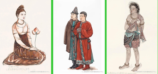 敦煌石窟壁画和彩塑人物造像生动自然、形态优美,服饰精致、图案华丽。唐代壁画和彩塑人物造像愈加生动写实,造型日趋丰腴,服饰形态多样,图案描绘细致,不仅再现了佛陀、菩萨、天王、飞天等佛国世界人物的服饰,还表现了天子、王侯、官吏及百姓等各社会阶层的服饰,以及西域地区及周边少数民族的服饰,而且唐代的供养人像服饰还突出反映了当时最奢华的流行时尚,折射出当时社会经济繁盛、中西文化交融的特点。