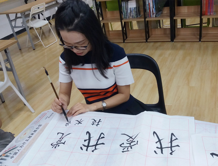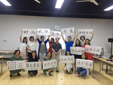 刘老师当场挥毫,临摹创作出的毛泽东书法作品震惊四座,大家惊叹于毛泽东书法的精湛与刘老师研究水平的高深。全体馆员在刘老师的指导下练习书法技艺,最后合力创作出本次活动的主旨“时尚北服、活力党建”以及“我爱我国 我爱我党 我爱我校 我爱我馆”,以墨香抒发对祖国、学校以及图书馆建设的的万丈豪情,党章党规学习入纸更须入己心,进一步深化了对党章的认识,增强党员的光荣感、责任感和使命感。