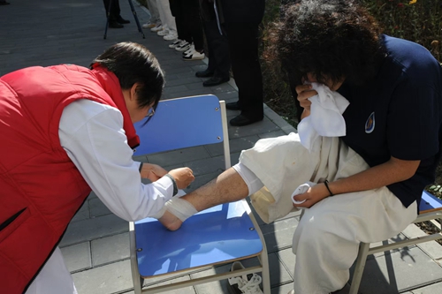 铁路电气化学校应急机构接讯后,按照预案接应消防车、组织现场警戒并协助开展救援;消防救援队抵达后,迅速开展灭火和人员搜救,医疗救护组到位后立即投入伤员救治。后续,“火情”被扑灭,楼内人员全部完成疏散,“被困人员”及时得到救治,工作人员清查“受损情况”和“失火原因”,组织善后工作、恢复正常秩序,演练圆满结束。