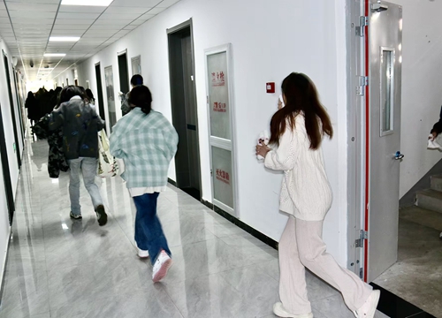 演练正式开始,工作人员启爆发烟弹,10号楼三层模拟意外失火,烟气迅速蔓延、触发烟感报警;消防控制室值班员和宿舍管理协同配合,现场确认火情后迅速报警,按照预案分工负责,紧张启动应急流程,消防广播、声光报警器发出警讯,疏散通道、安全出口全部打开。