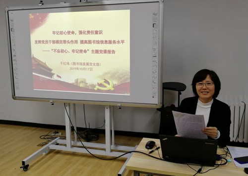 根据学校党委“不忘初心、牢记使命”主题教育总体部署安排,结合近期图书馆开展主题教育学习实际情况和各部门座谈、调研反馈问题,10月17日下午,图书馆直属党支部书记于红玮在图书馆二层多功能室讲授“牢记初心使命,强化责任意识——发挥党员干部模范带头作用,提高图书馆信息服务水平”专题党课。