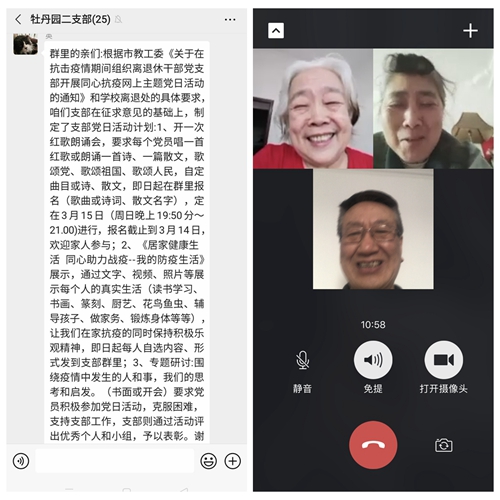 根据市委教育工委《关于在抗击疫情期间组织离退休干部党支部开展同心抗“疫”网上主题党日活动的通知》和离退休党委要求,牡丹园第二党支部组织支部全体党员借助支部微信群,以“同心抗疫”为主题,开展了一次别开生面的线上红歌朗诵会主题党日活动。
