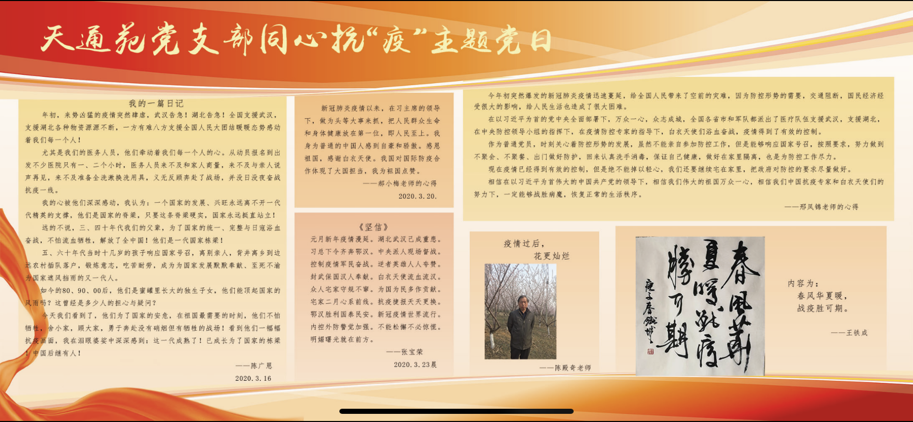 此次网上主题党日结束后,天通苑支部将党员们上交的作品材料制作成电子板报,在微信群中交流传阅。主题党日活动正值抗疫非常时期,老党员们用特殊的方式表达了对党和国家的热爱、对美好生活的追求,对打赢疫情防控阻击战的决心和信心,以实际行动让党旗在疫情防控阻击战中高高飘扬。