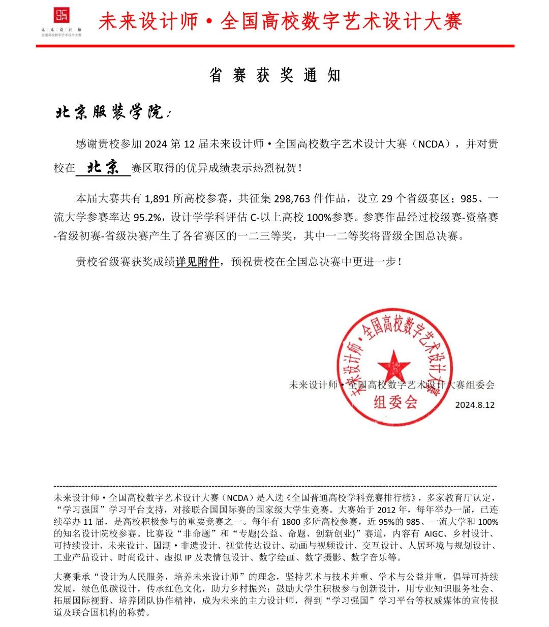 近日,由工业和信息化部人才交流中心主办的2024年第12届未来设计师·全国高校数字艺术设计大赛(NCDA)(以下简称“大赛”)落下帷幕。bb贝博艾弗森官网在全国赛区荣获“杰出组织奖”、北京赛区荣获“优秀组织奖”。bb贝博艾弗森官网美术学院在此次大赛中积极响应,共提交38件作品。在全国总决赛中,张仰豪、黄瑀晟学生作品《合韵》获得本科组二等奖,张婷、王京晶、李旻钰学生作品《<丝绸>杂志封面插画》获得研究生组三等奖,张楠、李栋两位老师在全国总决赛中获得“优秀指导教师奖”,张楠老师在全国总决赛、北京赛区获得“优秀组织教师奖”。