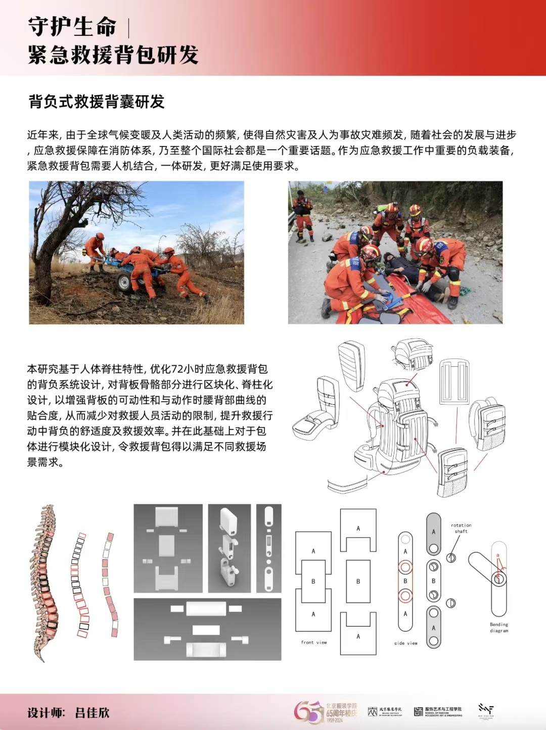 学院始终坚持“为人民而设计”,师生在面向户外活动、应急救援多场景应用下,研发各类适用的鞋品箱包。代表性成果包括背负式救援背囊、户外徒步鞋靴等。