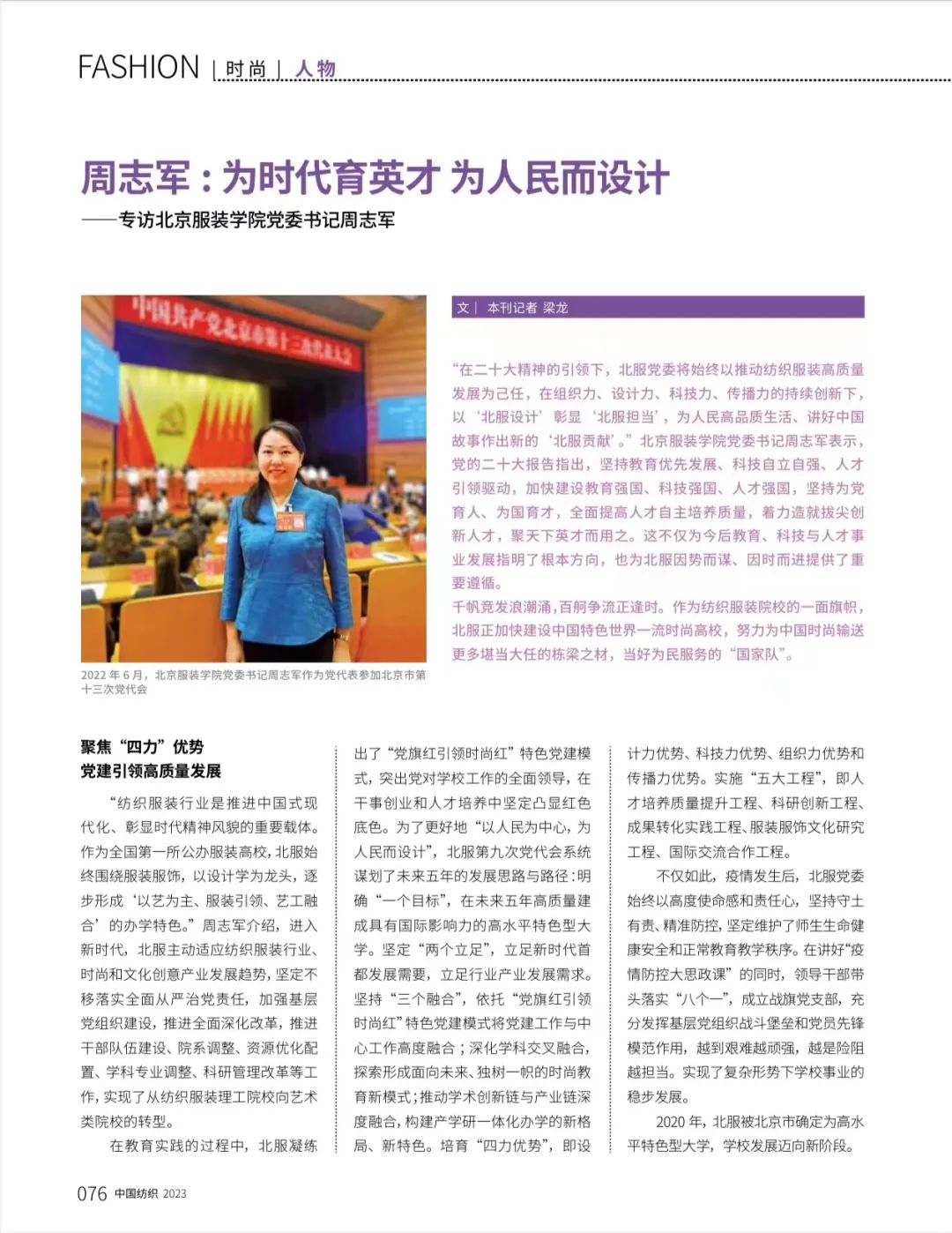 在党的二十大精神引领下,bb贝博艾弗森官网正加快建设中国特色世界一流时尚高校,当好为民服务的“国家队”。我校党委书记周志军近日接受中国纺织工业联合会会刊《中国纺织》杂志采访,从聚焦“‘四力’优势,党建引领高质量发展”“心怀国之大者 回应时代需求”“强化学科优势 拓宽国际视野”“以需求为导向 构建人才培养共同体”“探索新模式 构建时尚教育新格局”五个方面进行了深入阐述。