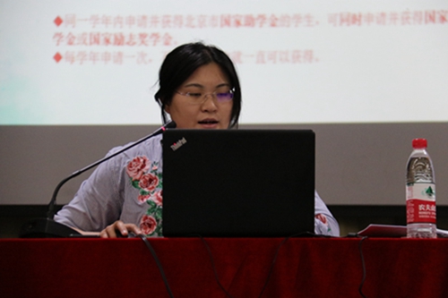 讲座首先介绍了我校资助体系的基本情况,我校资助体系是以国家资助为主体,社会资助为支撑,学校资助为重点,奖、贷、助、勤、补、减六位一体,统筹协调的完善资助体系。接下来,杨赛老师主要围绕国家助学贷款,奖学金,助学金和应征入伍服义务兵役学费补偿贷款代偿及学费资助四个主要方面对我校学生资助政策展开了详细的介绍。