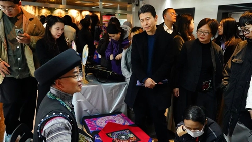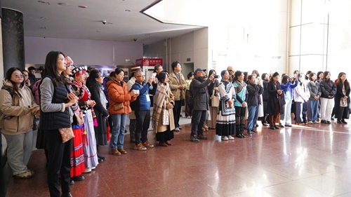 展览现场,苗族传统刺绣传承人廖力耕、哈尼族树皮制作技艺传承人张卫平进行了非遗展演,生动展示了非遗服饰制作技艺,让观者深切感受到民族相通共融的生活智慧与审美情趣,为展览增添了浓墨重彩的一笔。