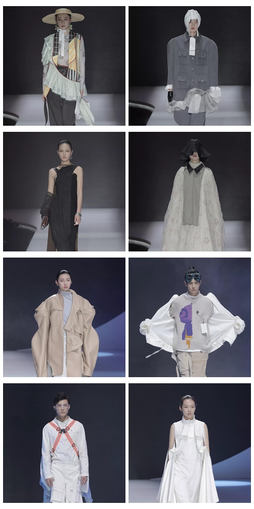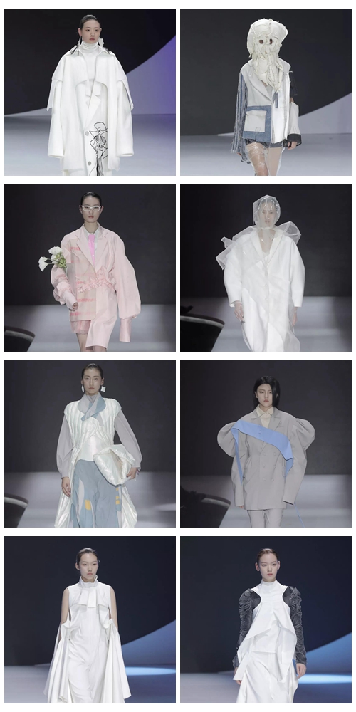 两场大秀风格鲜明态度各异,据班级秀负责人罗振宇介绍:女装“上”表现一种高屋建瓴的冲劲,“下”则突出静水深流的力量。“下”的展演分为简洁、鲜艳、解构、戏剧化四个段落,设计师们细腻观察时尚风潮流动中的精神意象,从各自不同的文化背景源起,深入探究了“美好”元素在新时期的表述意义,不断拓展女性美学的边界,秀场上洋溢着令人震撼的艺术想象力和创造力。