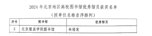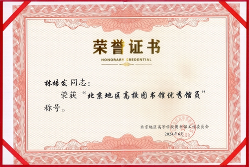 在北京地区高校图书馆工作委员会组织的2024年评优活动中,我校图书馆荣获“2024年北京地区高校图书馆先进集体”、馆员林培发获评“2024年北京地区高校图书馆优秀馆员”称号。