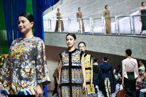 “服饰大秀”将京绣、黎锦、苏绣、粤绣各主题同台竞技,与京剧《贵妃醉酒》、琼剧《百花公主》、昆曲《游园惊梦》等经典剧目完美交融,不同旋律接续响起,余音交织,加上“云上锦”的流苏装置的氛围营造,情景化、沉浸式打造非遗策展新范式,为观众带来了一场别开生面的视听享受。