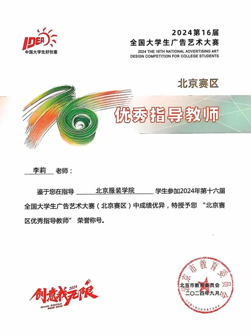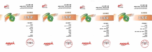 我校在本届大广赛北京赛区比赛中共斩获一等奖11个、二等奖19个、三等奖22个,参赛学生分别来自时尚传播学院、艺术设计学院、美术学院和商学院。时尚传播学院教师李莉获评北京市教育委员会颁发的“北京赛区优秀指导教师”荣誉称号(北京赛区共30位)。我校获评北京市教育委员会颁发的“北京赛区优秀组织单位” (北京赛区共10个)。