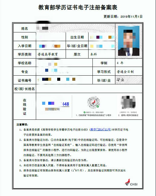 《教育部学籍在线验证报告》和《教育部学历证书电子注册备案表》样例: